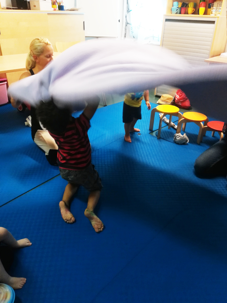 Im Familienzentrum stehen Tische und Stühle kreuz und quer verteilt, von der Decke hängen Luftballons und der Boden ist mit blauen Matten bedeckt. Überall springen, laufen und klettern Kinder über, unter und zwischen den Tischen und Stühlen. Was ist hier los?!