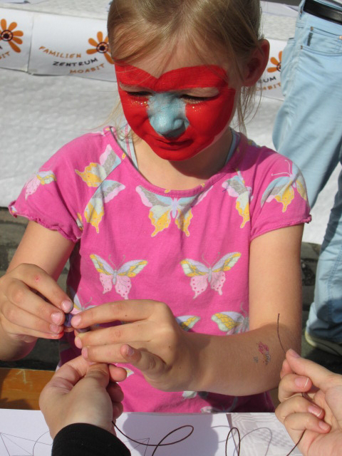 Bild - Mädchen hält ihre ZeichnungBild - Hände auf einem Tisch beim ausmalen auf PapierBild - Kind mit bemaltem Gesicht und selber gebastelter HalsketteBild - Kind mit bemaltem Gesicht bastelt eine HalsketteBild - Kind am Basteltisch