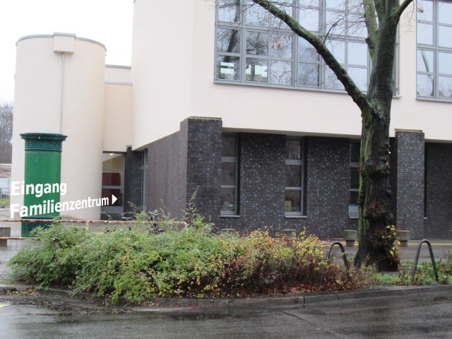 So sieht der Eingang derzeit aus, da die Eingangstafel noch in Arbeit ist. Es ist die linke Tür, bei der Litfaßsäule.