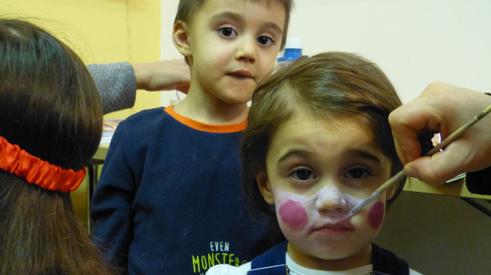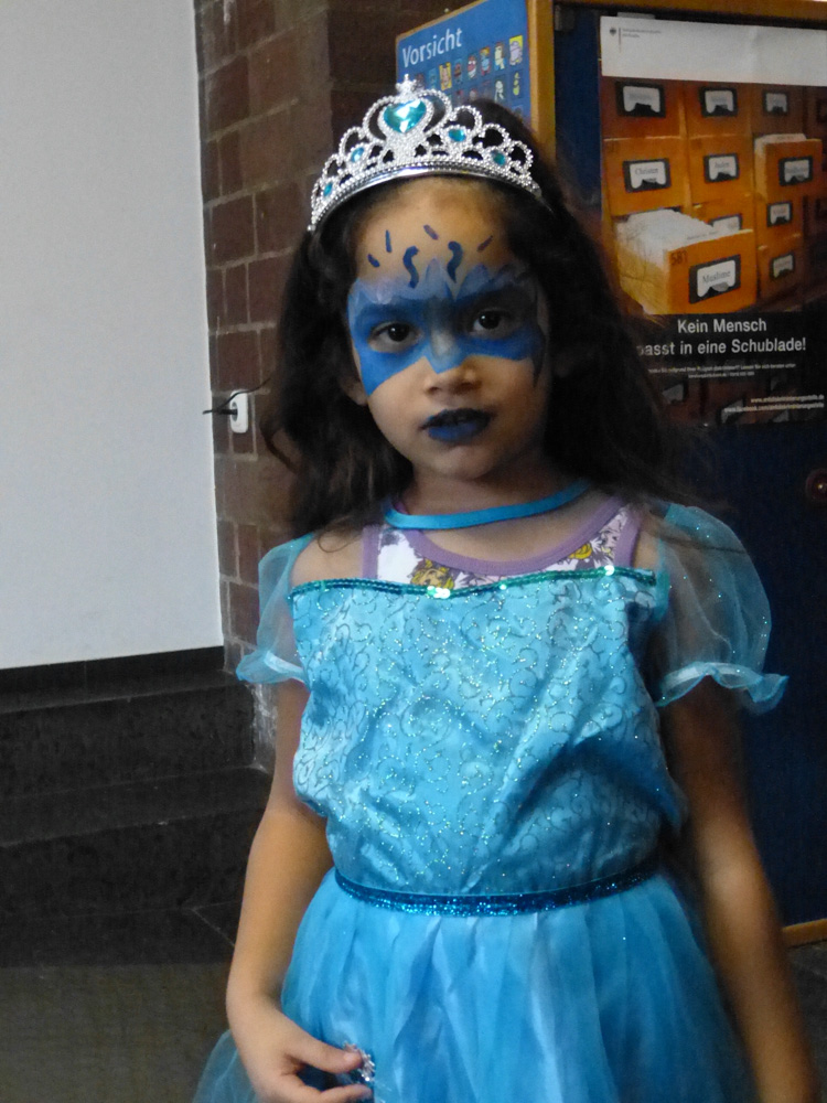 Im einen Raum gab es eine Spielecke für die Jüngeren, eine Tanzfläche für die Größeren und eine Schminkstation, die tatsächlich von Anfang bis zum Ende des Festes in Betrieb war, bis auch wirklich jedes einzelne Kind zur Vollendung des Kostüms geschminkt war.
