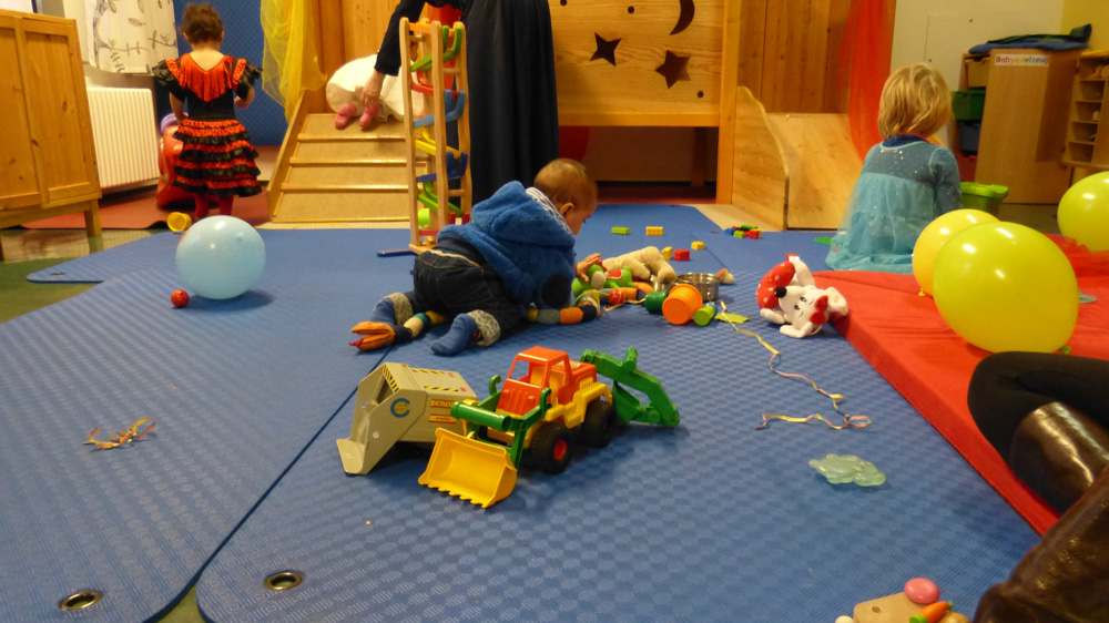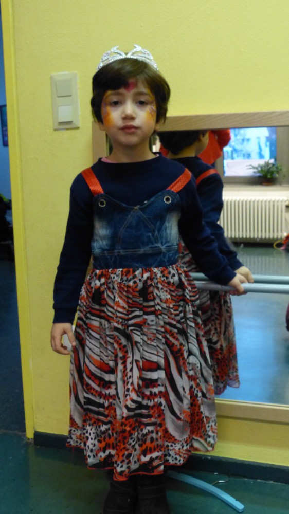 Foto: kleines Mädchen wird gerade mit Pinsel im Gesicht bemalt. Im Hintegrund schaut ein Junge zu. Beide Blick zum Betrachter.Foto: Porträt eines Junge mit bemaltem Gesicht (Motiv Tieger) und hochgezogener Augenbrauen mit Blick zum Betrachter.Foto: Kind mit schwarzem Mäntelchen und Kappe auf Dreirad von hinten. Im Hintergrund spielt im Nebenraum ein anderes Kind auf dem Fussboden.Foto: Mädchen mit blauem Kleid und blauer Bemalung im Gesicht blickt zum Betrachter.Foto: Mädchen mit weiß-rot-schwarz gemustertem Rock, bunt bemaltem Gesicht und Krone auf dem Kopf mit Blick zum Betrachter vor einer Wand mit Spiegel.Foto: 3 Kleinkinder spielen mit diversem Spielzeug auf dem Fußboden. Rückenansicht.Foto: Kind und erwachsener Mann schäkern lachend und ziehen an der selben Tischtenniskelle. Kind im Hintergrund schaut zu.