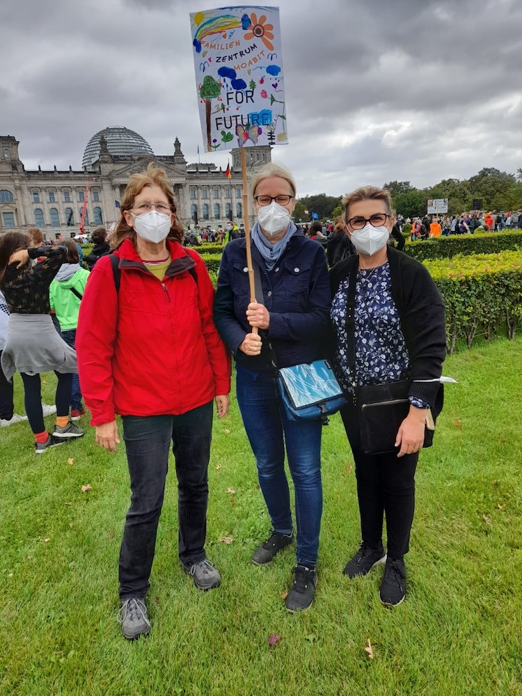 Fridays for Future hatte zum Freitag, den 24.9.2021 zum weltweiten Klimastreik aufgerufen. In Berlin kamen 100.000 – und wir waren dabei. Wir standen vor dem Reichstag, danach sind wir noch ein Stück die Route mitgelaufen. Es hat Spaß gemacht und wir haben ein politisches Zeichen gesetzt. Das Plakat haben Kinder aus dem Familienzentrum mit gestaltet.