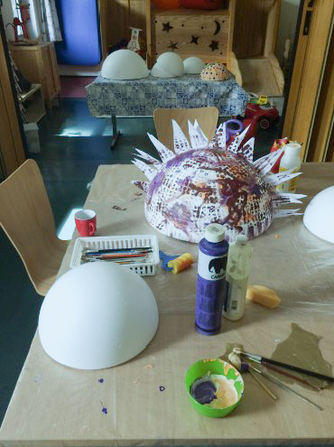 Foto: 9 bunt bemalte Styropor-Halbkugeln auf einem Tisch mit blau gemusterter TischdeckeFoto: auf eine Tisch eine weiße Styropor-Halbkugel im Vordergrund, eine bemalte und beklebte Styropor-Halbkugel dahinter. Dazwischen Malzeug.Foto: auf eine Tisch eine weiße Styropor-Halbkugel am linken Rand, dahinter und vorne je eine bemalte Styropor-Halbkugel. Dazwischen Malzeug und kretaiv werkelnde Hände.Foto: eine bunt bemalte Styropor-Halbkugeln auf einem Tisch mit blau gemusterter TischdeckeFoto: auf eine Tisch zwei weiße Styropor-Halbkugel im Hintergrund, eine bemalte und beklebte Styropor-Halbkugel mittig. Davor und dazwischen Malzeug.Foto: auf eine Tisch eine blau bemalte Styropor-Halbkugel und eine malende Hand mit Pinsel im Vordergrund, eine weiße Styropor-Halbkugel und Malzeug dahinter.Foto: eine mit Sonne und Wolke bemalte und mit Baum und Storch sowie Wolken beklebte Styropor-Halbkugeln auf einer Bank vor einem Heizkörper.Foto: 9 bunt bemalte Styropor-Halbkugeln auf einem Tisch mit blau gemusterter Tischdecke