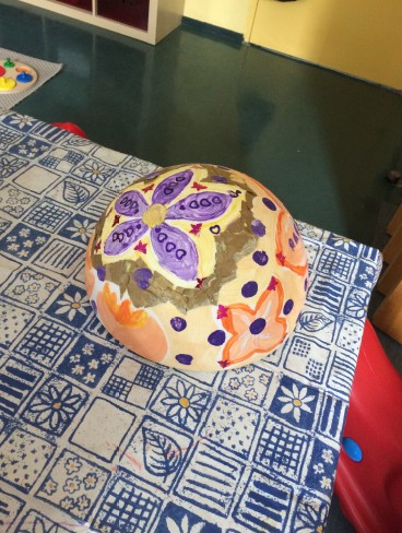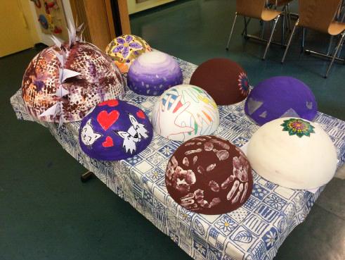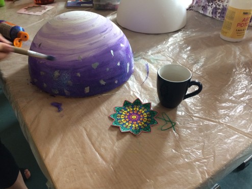 In unserem offenen Kreativ-Angebot für Familien und Geflüchtete haben wir heute große und kleinere Halbkugeln aus Styropor mit bunten Farben, Glitzer und Seidenpapier gestaltet. Es wurde geklebt, gepinselt und mit Händen gemalt. Die angenehme konzentrierte Arbeitsatmosphäre führte zur gegenseitigen Inspiration und Vielfältigkeit.