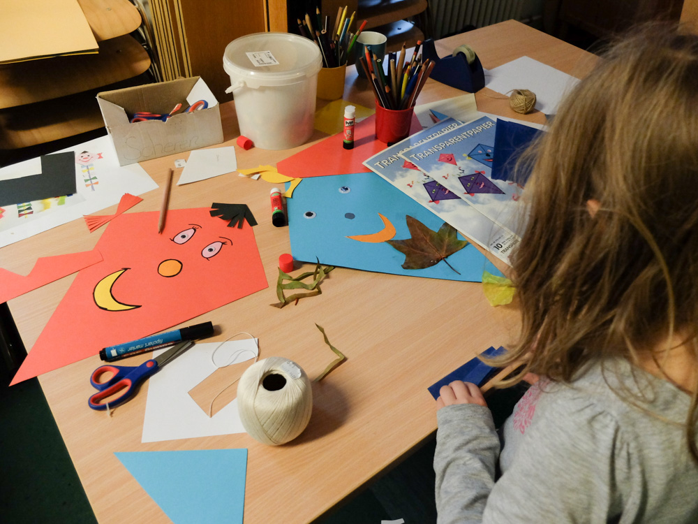 In der ersten Ferienwoche schufen wir aus Karton, Buntpapier, getrockneten Blättern, Federn und anderen Materialien schöne Drachen zum Verzieren von Fenstern und / oder den Kinderzimmern. So entstand eine farbenfrohe und freundliche Herbstdekoration. Nicht nur die Kinder hatten hier Ihren Spaß, auch die Erwachsenen fertigten mit Eifer die bunten Windgleiter an!