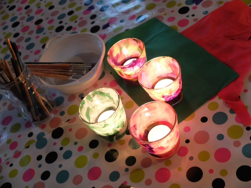 In der zweiten Woche ging es mit dem Bemalen von Windlichtern weiter. Zuerst aber mussten die Kinder, die von uns versteckten Materialien im Bewegungsraum finden. Am großen Basteltisch gestalteten nun die Kinder, gemeinsam mit ihren Eltern, unterschiedlich farbig leuchtende Kerzenhalter. In einem kreativen Prozess entstanden schöne bunte Blickfänge, mit denen wir im Abschlusskreis eine magische Atmosphäre zauberten. Kinder und Erwachsene nahmen ihre Windlichter mit nach Hause, wo sie hoffentlich weiterhin für eine gemütliche Stimmung sorgen!