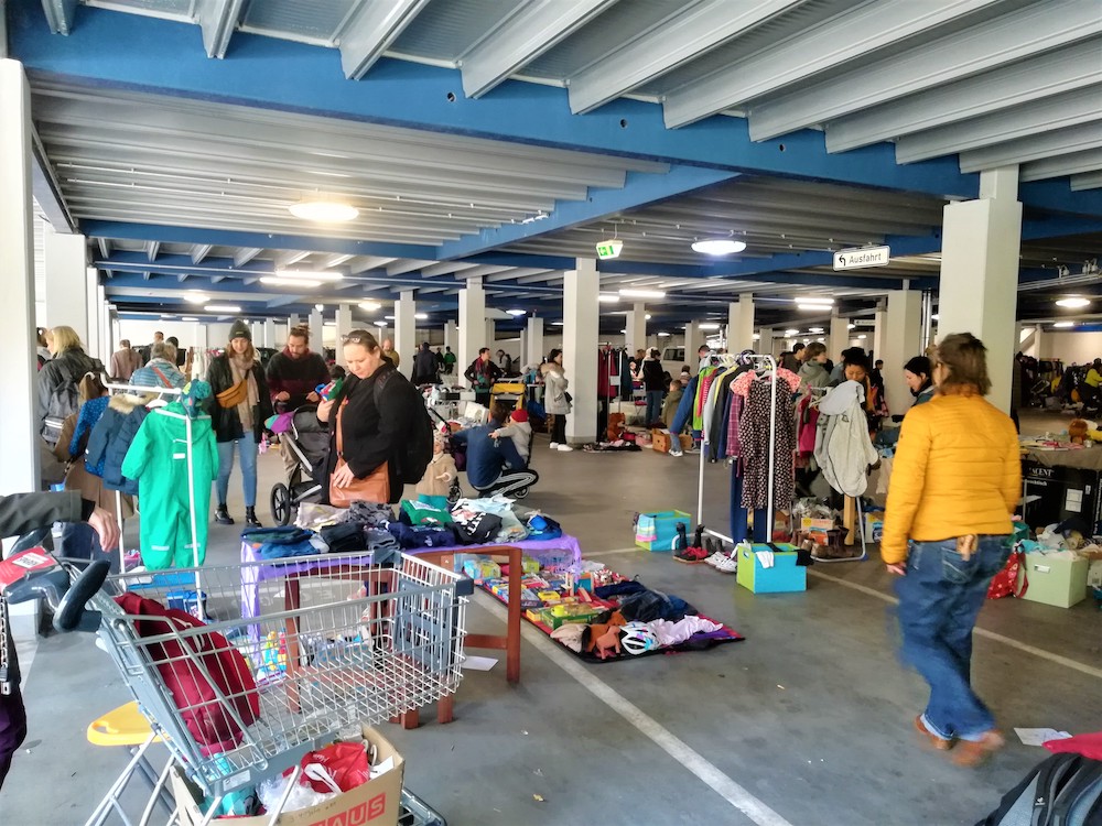 Foto: viele bunte Flohmarktstände in einem Parkhaus
