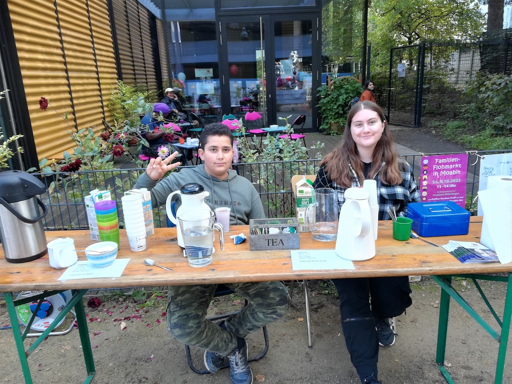 Foto: Ein Bierzelttisch, darauf Tee, Kaffee und Becher, dahinter sitzen zwei Jugendliche, der linke macht ein Peace Zeichen mit seiner Hand