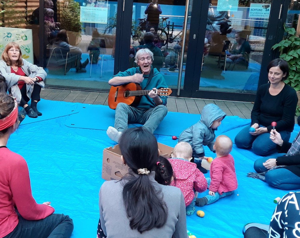 Foto: In der Mitte ein Mann mit Gitarre, drum herum sitzen Frauen, in der Mitte spielen Babys