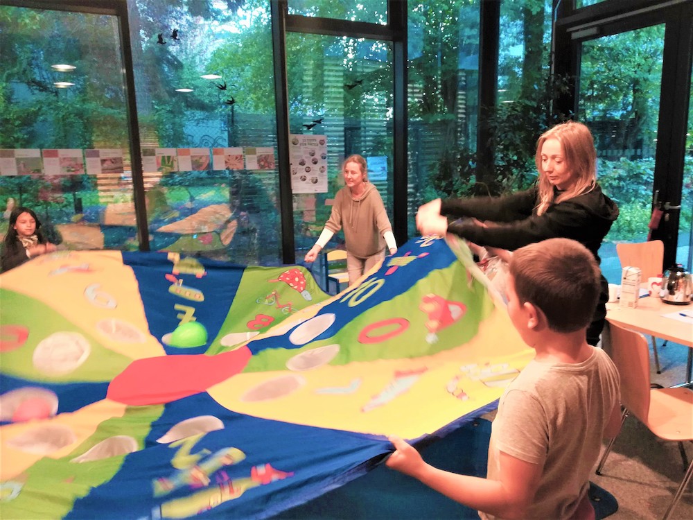 Foto: Schwungtuch in der Mitte des Bildes, am Rand rechts stehen drei Mensche, die es halten