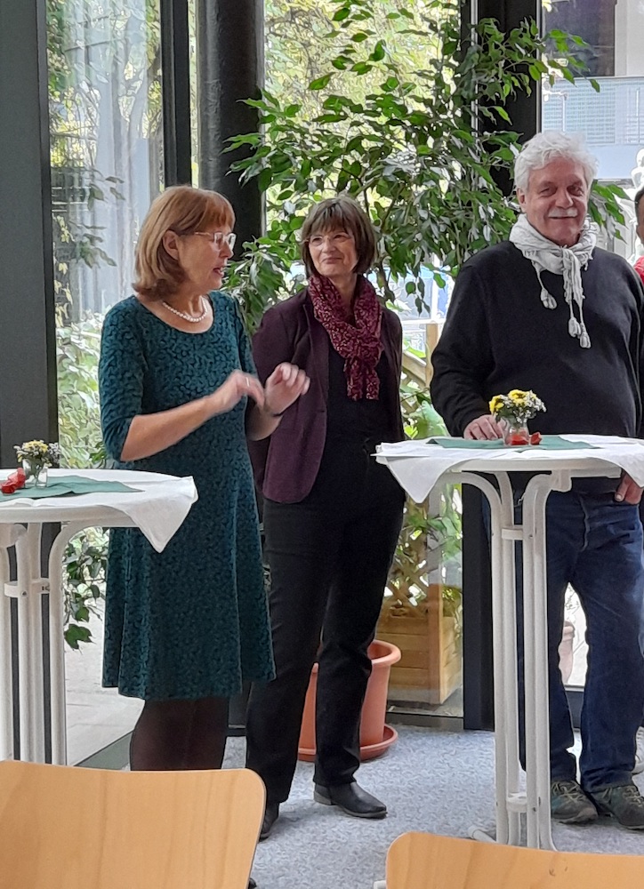 Foto: drei Menschen vor einem Stehtisch, alle lachen