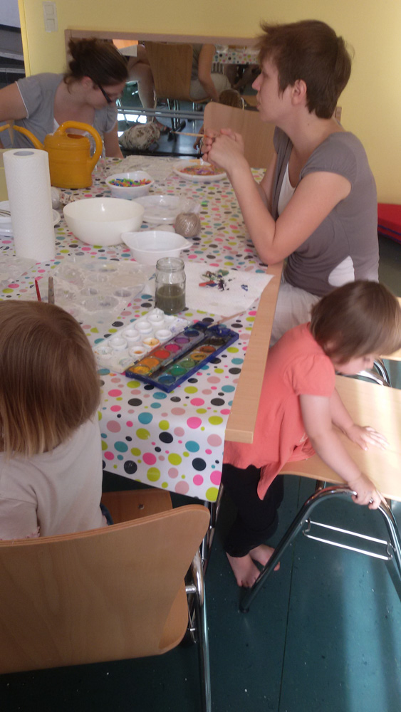 Foto: Eltern unterhalten sihc na einem Tisch, Kinder malen dabeiFoto: Kind bemalt Gipsfigur an einem Tisch. Mutter sitzt mit Baby im Arm danaben und erklärt.